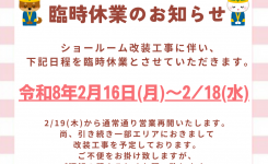 みなさんこんにちは☺ 本日は、臨時休業のご案内です。 ショールーム床改装工事に伴い、 『2月16日(月)〜2月18日(水…
