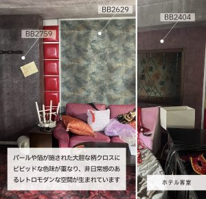 ビビッドなインテリアが重なり、非日常感が漂うレトロモダンな空間が生まれています。