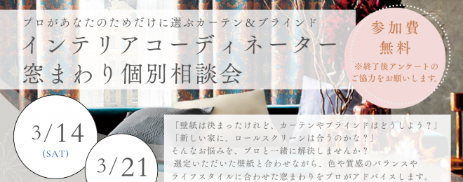 みなさん、こんにちは😊 ショールーム担当のリサです✨ 今日はイベントのご案内です 3月14日(土)、21日(土)の2日間、 「インテリアコーディネーター窓まわり無料相談会」を開催します 時間帯は10:00~ 12:00~ 15:30~ の3枠となっています。 こ…